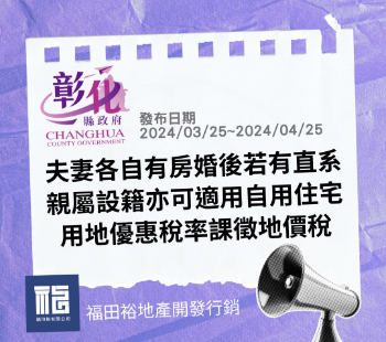 稅務局進一步說明,土地所有權人與配偶及未成年之受扶養親屬,適用自用住宅用地稅率課徵地價稅,以一處為限,但如將夫或妻之住宅另供成年子女、父母、祖父母、岳父母、公婆等直系親屬設籍居住,且符合自用住宅用地規定,在土地所有權人所有都市土地面積300平方公尺,非都市土地面積700平方公尺的範圍內,亦可申請按自用住宅優惠稅率課徵地價稅。