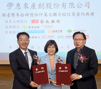 彰化銀行統籌主辦惠來產創股份有限公司四年期新臺幣34.5億元聯合授信案,於22日舉行簽約儀式,由彰化銀行董事長凌忠嫄代表聯貸銀行團與惠來產創公司董事長顏世陸共同完成簽約。