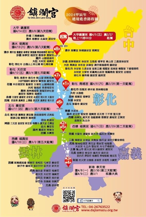2024年的大甲媽祖遶境路線,將自台中大甲鎮瀾宮起駕,沿途經過台中(清水區、沙鹿區、大肚區)、彰化(彰化市、員林市、北斗鎮、溪州鄉)、雲林(西螺鎮、二崙鄉、虎尾鎮、土庫鎮、元長鄉),第3天晚間抵達嘉義新港鄉奉天宮駐駕,停留一天舉行祈福、祝壽大典。