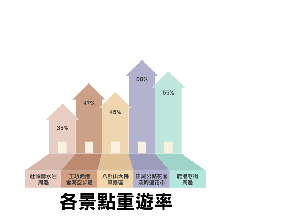 進一步就遊憩行為分析,外縣市遊客留宿率約為16.8%;重遊率最高為田尾公路花園及周邊花市的58%,其次為鹿港老街周邊的56%;而前3名旅次鏈,依次是「王功漁港(含海空步道)→鹿港老街周邊」、「鹿港老街周邊→王功漁港(含海空步道)」及「田尾公路花園及周邊花市→員林車站及周邊」。