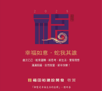✨瑞蛇呈祥,步步高升✨ 福田裕建設祝福鄉親好友,闔家健康平安。 幸福如意,蛇我其誰,福田裕堅定信念, 為希望與圓夢,開啟嶄新生活! 成就非凡的您新年給親愛家人, 一個最幸福與溫度的居住御墅。 福田裕建設-領袖新作【觀雲藏】 超然眼界,福運高照!